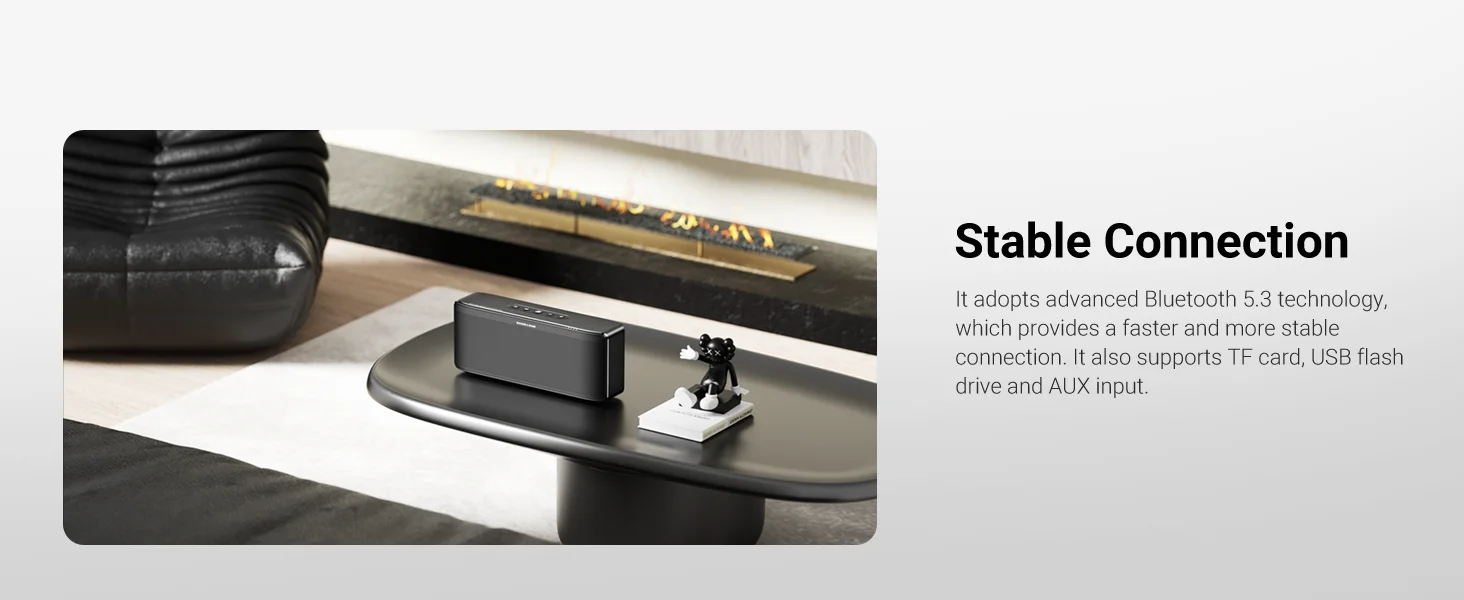 It adopts advanced Bluetooth 5.3 technology,which provides a faster and more stableconnection.lt also supports TF card, USB flashdrive and AUX input.