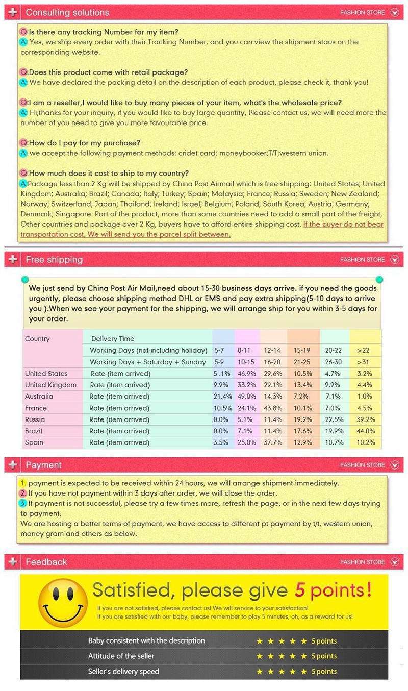 We are a kind and honest vendor, and hope each our customers will enjoy their shopping from my Ali express. We will go through our feedback file in a regular period, and will leave positive feedback for all of our kind customers. If you are happy with the purchases here, 5 stars rating positives would be appreciated. And if you have any questions regarding any transaction, please feel free to contact me before you leave any feedbacks. Thank you. Hope every customer can leave 5 stars rating positives feedback. Thank you.