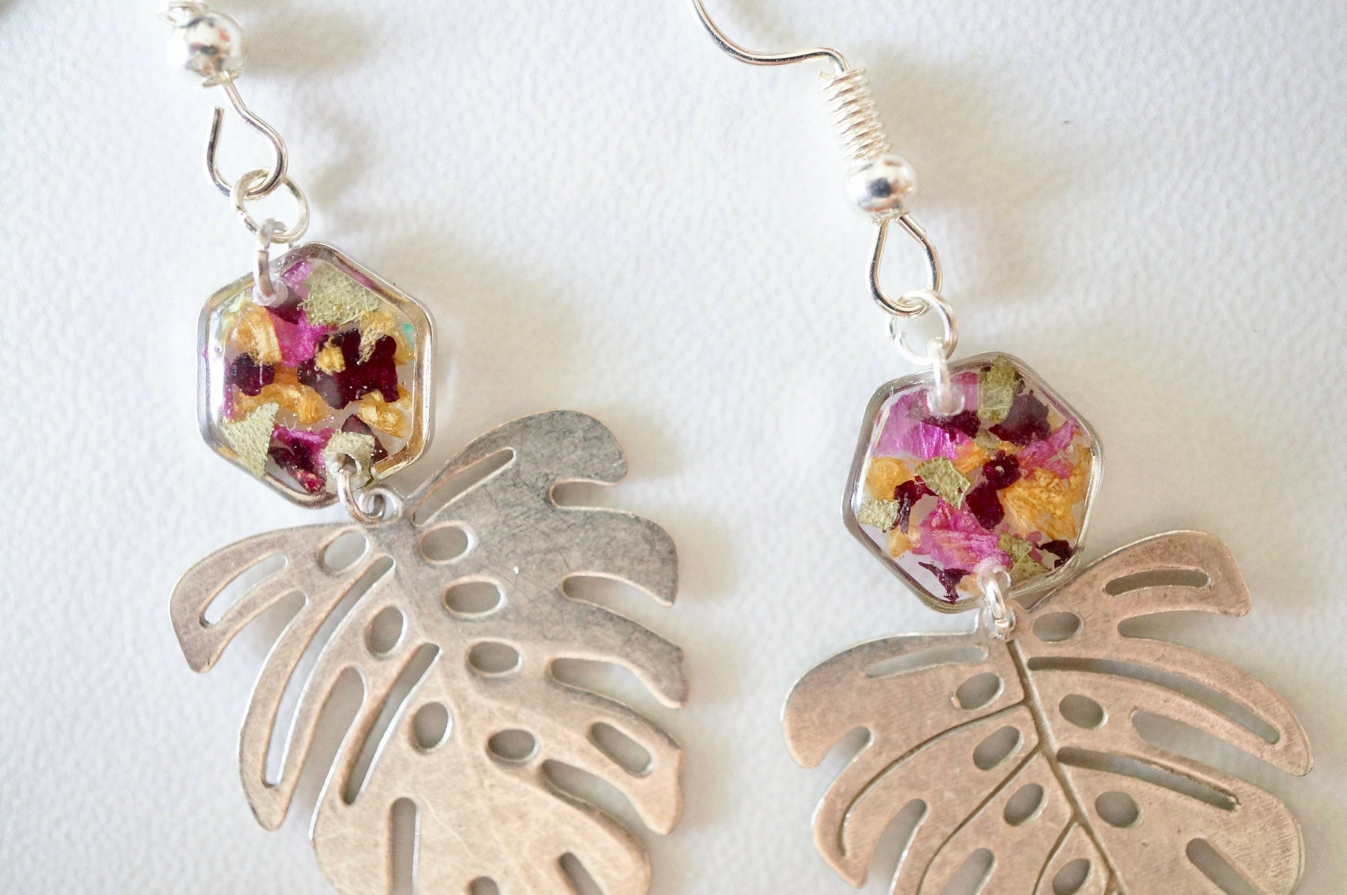Real Pressed Flowers and Resin Drop Earrings, Silver Palm Leaf and Hexagons in Floral Mix